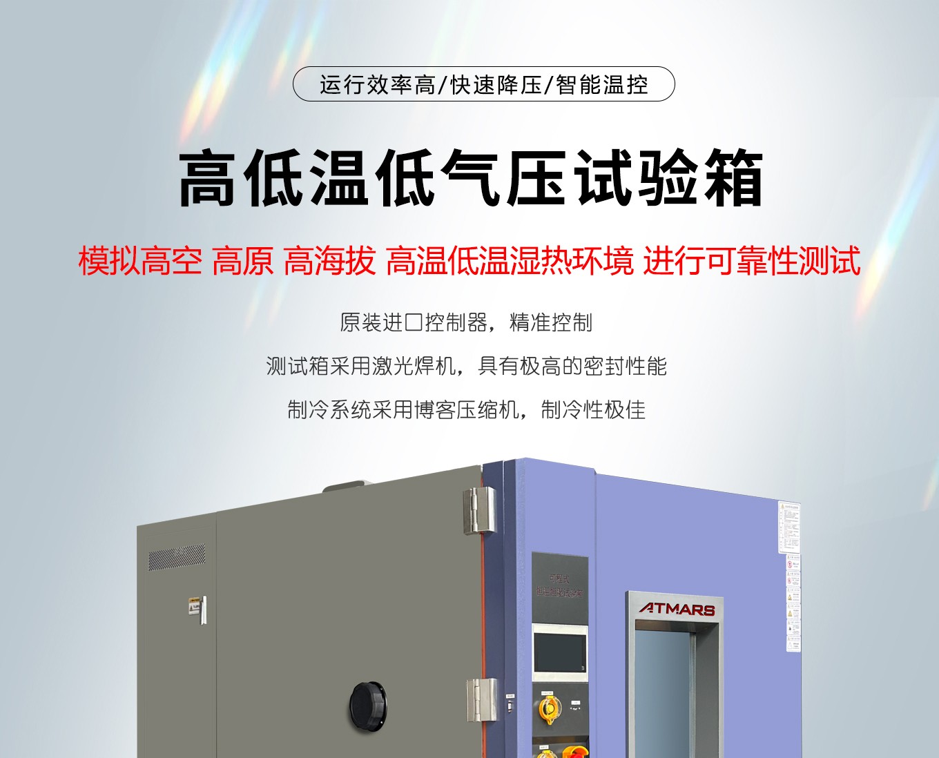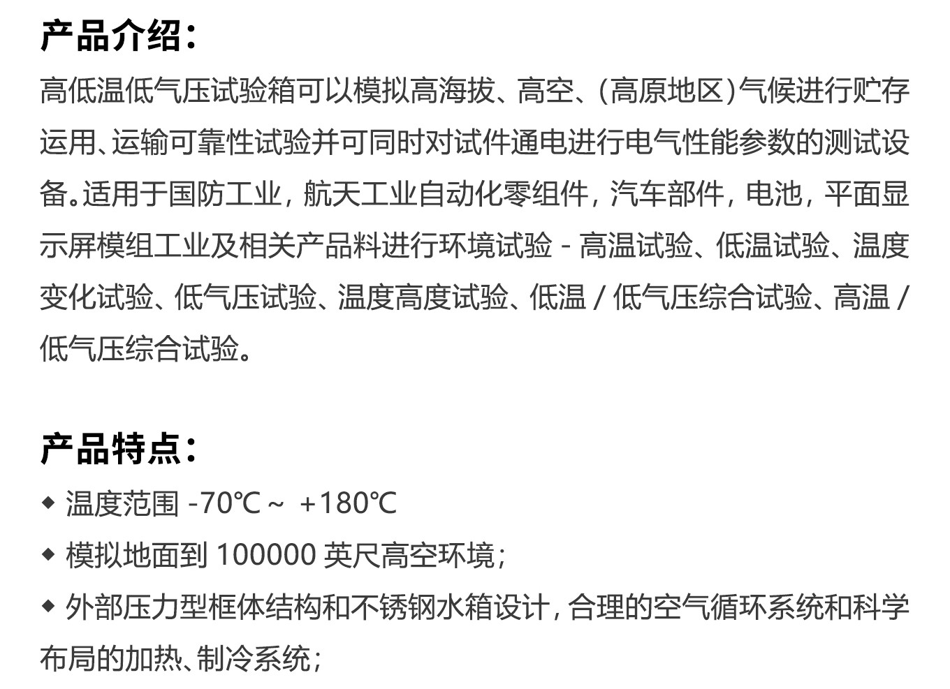 高低溫低氣壓快猫网站入口適用於國防工業,航天工業自動化零組件,汽車部件,電池,平麵顯示屏模組工業及相關產品料進行環境試驗-高溫試驗、低溫試驗、溫度變化試驗、低氣壓試驗、溫度高度試驗、低溫/低氣壓綜合試驗、高溫/低氣壓綜合試驗。