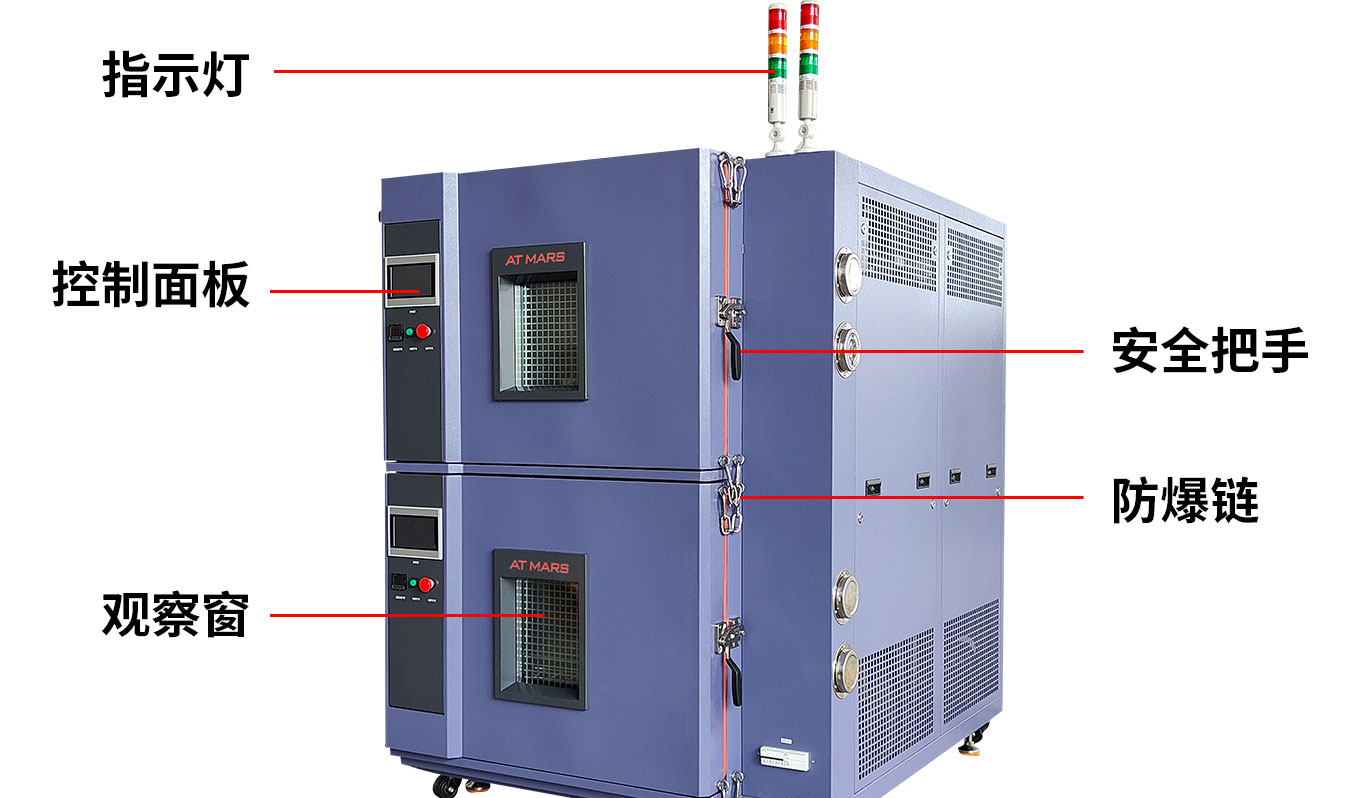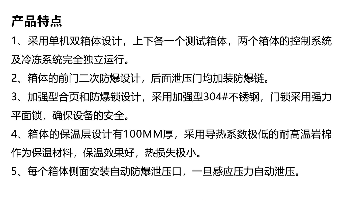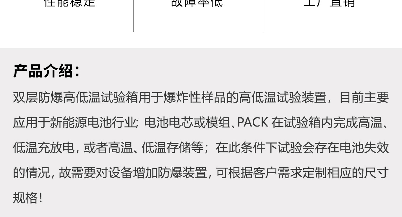雙層防爆高低溫快猫网站入口用於爆炸性樣品的高低溫試驗裝置,目前主要應用於新能源電池行業;電池電芯或模組、PACK在快猫网站入口內完成高溫、低溫充放電,或者高溫、低溫存儲等;在此條件下試驗會存在電池失效的情況,故需要對設備增加防爆裝置,可根據客戶需求定製相應的尺寸規格!