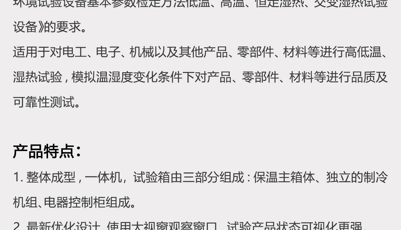 本係列快猫网站入口適用於工業產品的可靠性試驗,具有溫濕度控製精度和控製範圍寬的特點,性能指標符合GB5170.2.3.5.6-95《電工電子產品環境試驗設備基本參數檢定方法低溫、高溫、恒定濕熱、交變濕熱試驗設備》的要求。