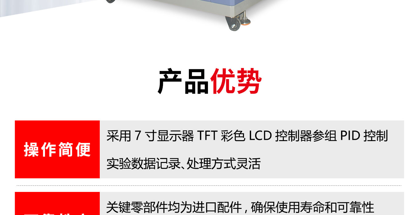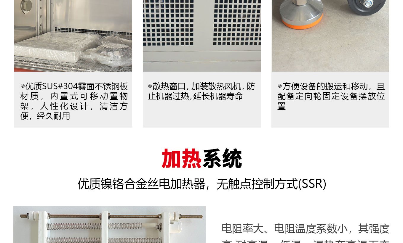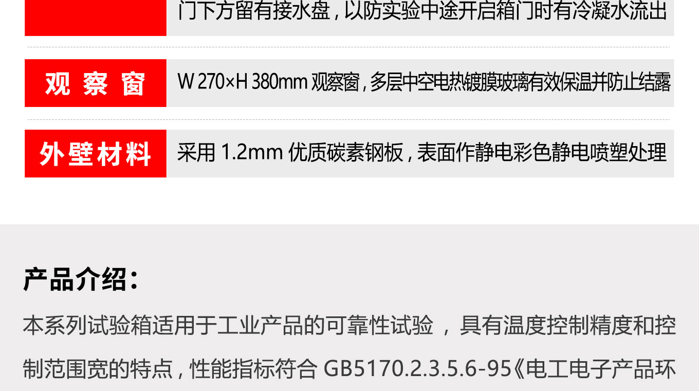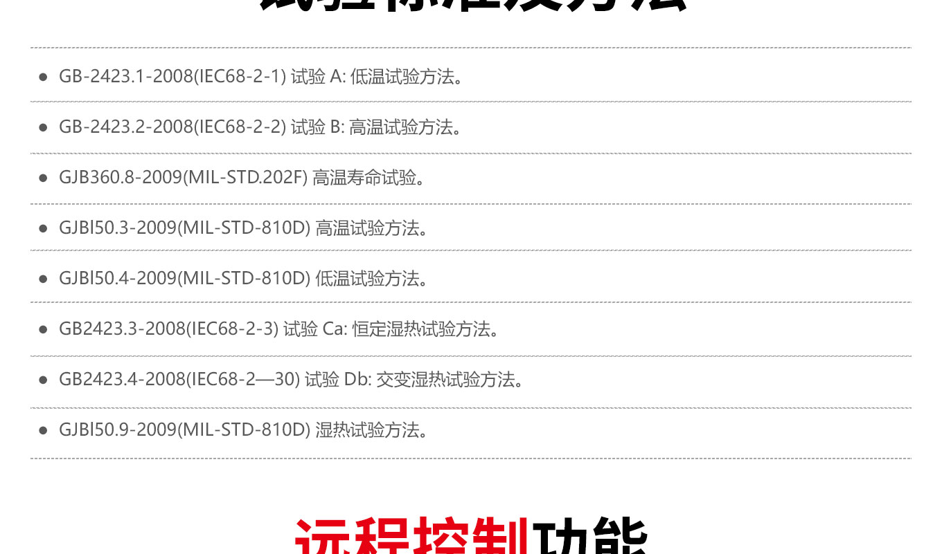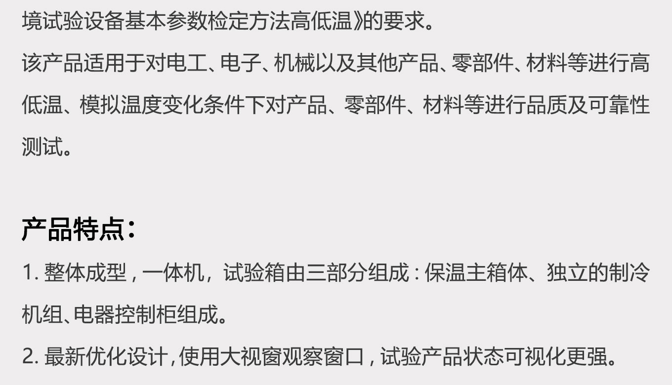 本係列快猫网站入口適用於工業產品的可靠性試驗,具有溫度控製精度和控製範圍寬的特點,性能指標符合GB5170.2.3.5.6-95《電工電子產品環境試驗設備基本參數檢定方法高低溫》的要求。 該產品適用於對電工、電子、機械以及其他產品、零部件、材料等進行高低溫、模擬溫度變化條件下對產品、零部件、材料等進行品質及可靠性測試。