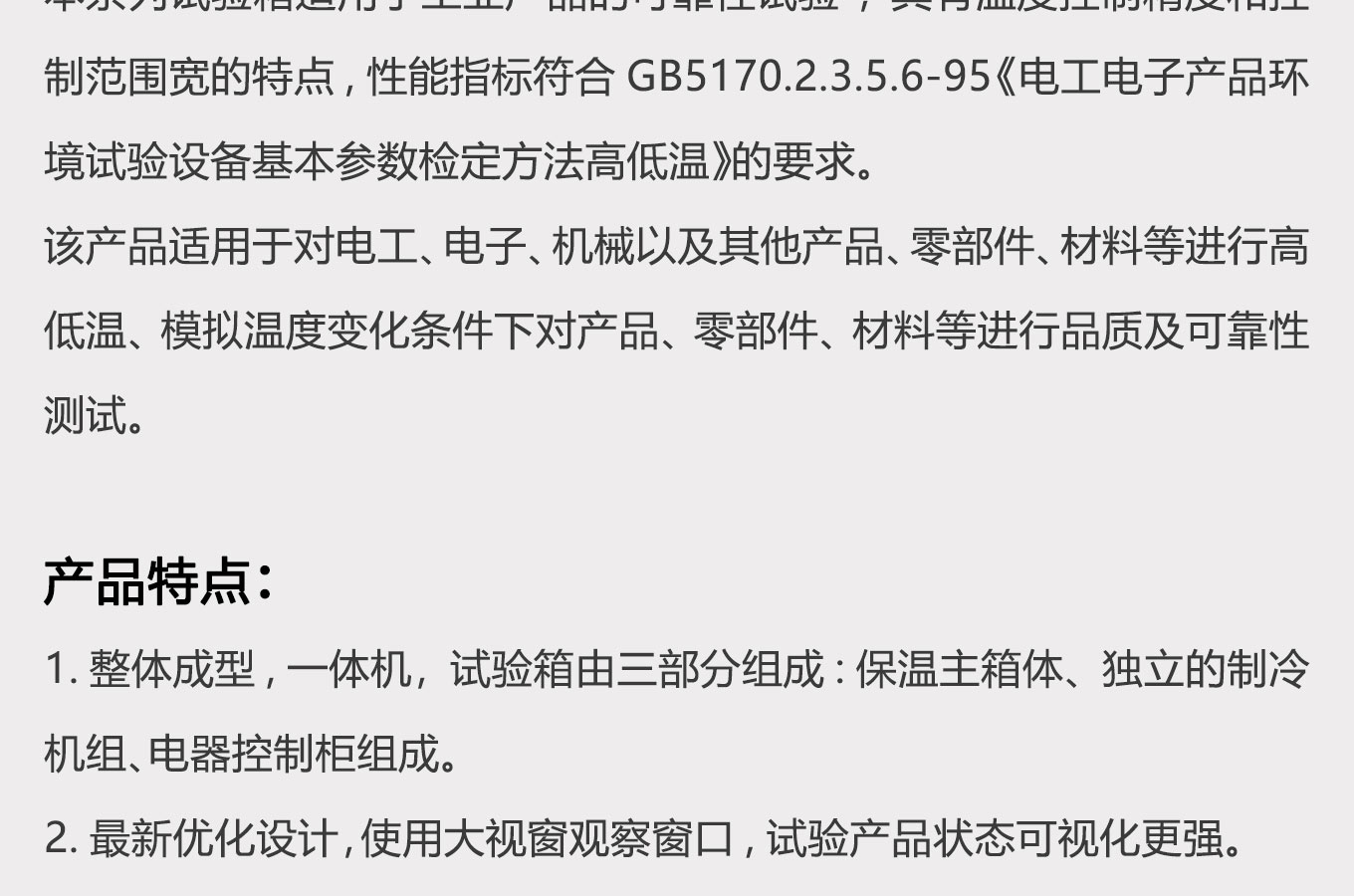 本係列快猫网站入口適用於工業產品的可靠性試驗,具有溫度控製精度和控製範圍寬的特點,性能指標符合GB5170.2.3.5.6-95《電工電子產品環境試驗設備基本參數檢定方法高低溫》的要求。
