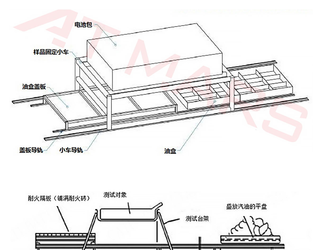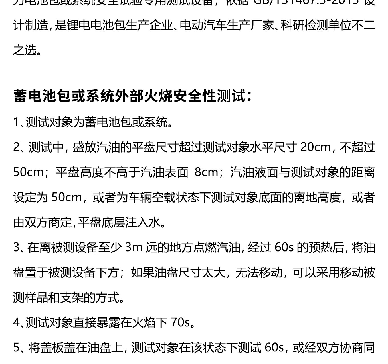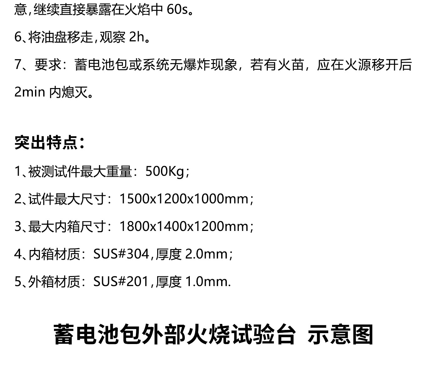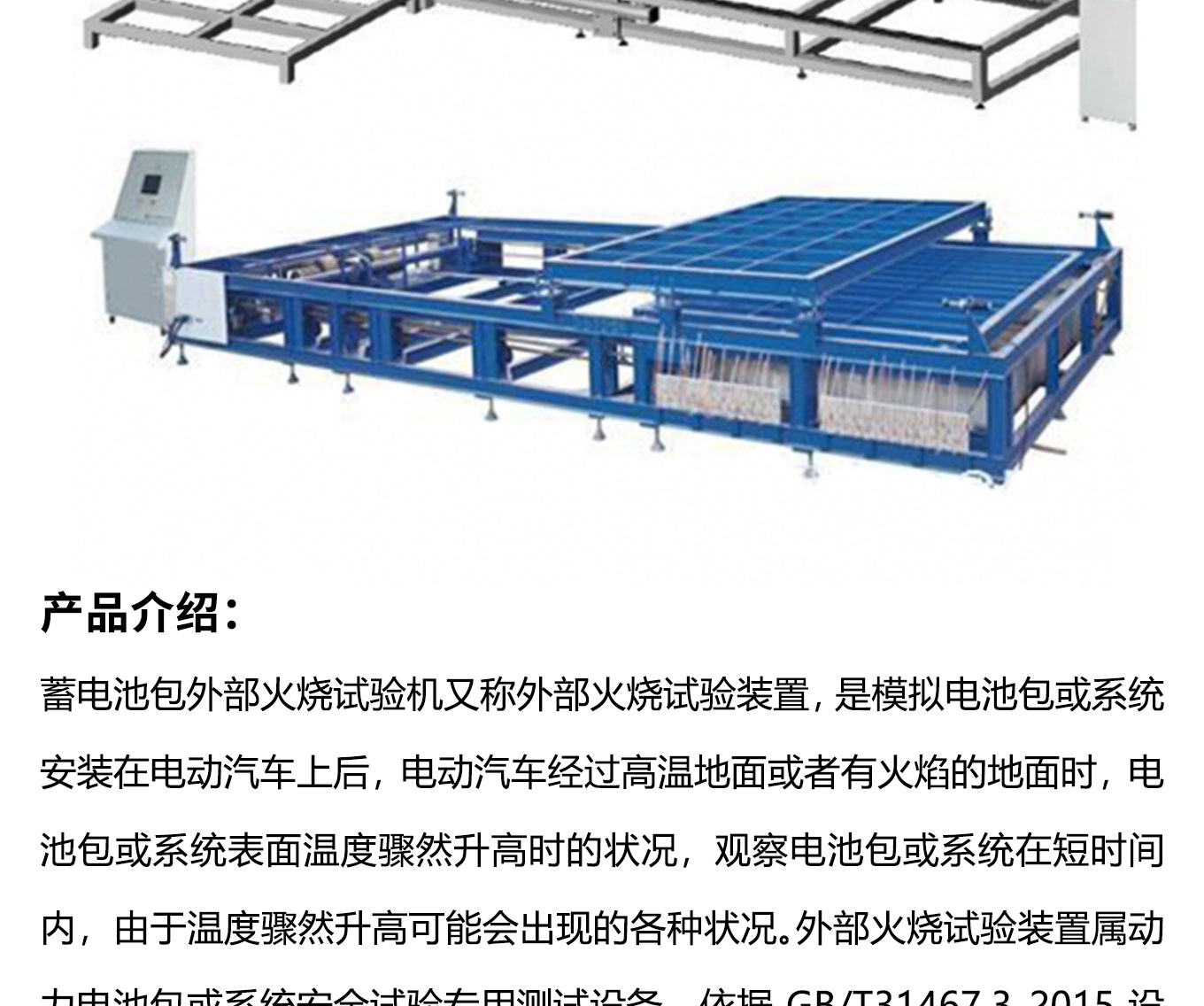 蓄電池包外部火燒試驗機又稱外部火燒試驗裝置,是模擬電池包或係統安裝在電動汽車上後,電動汽車經過高溫地麵或者有火焰的地麵時,電池包或係統表麵溫度驟然升高時的狀況,觀察電池包或係統在短時間內,由於溫度驟然升高可能會出現的各種狀況。