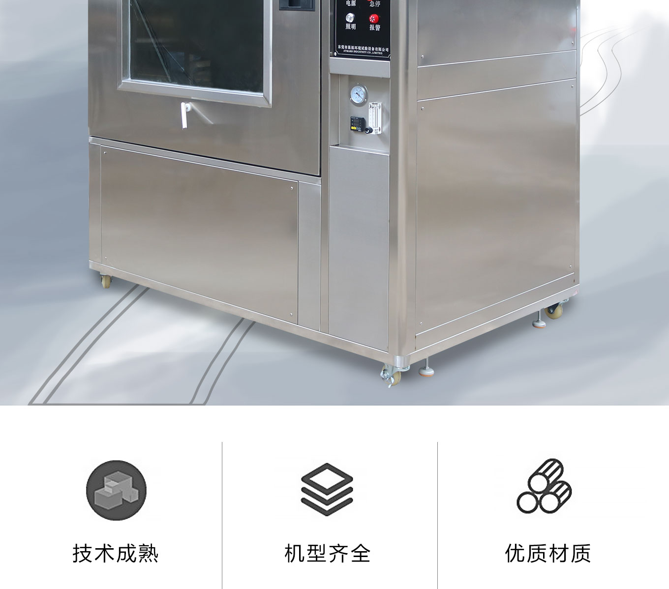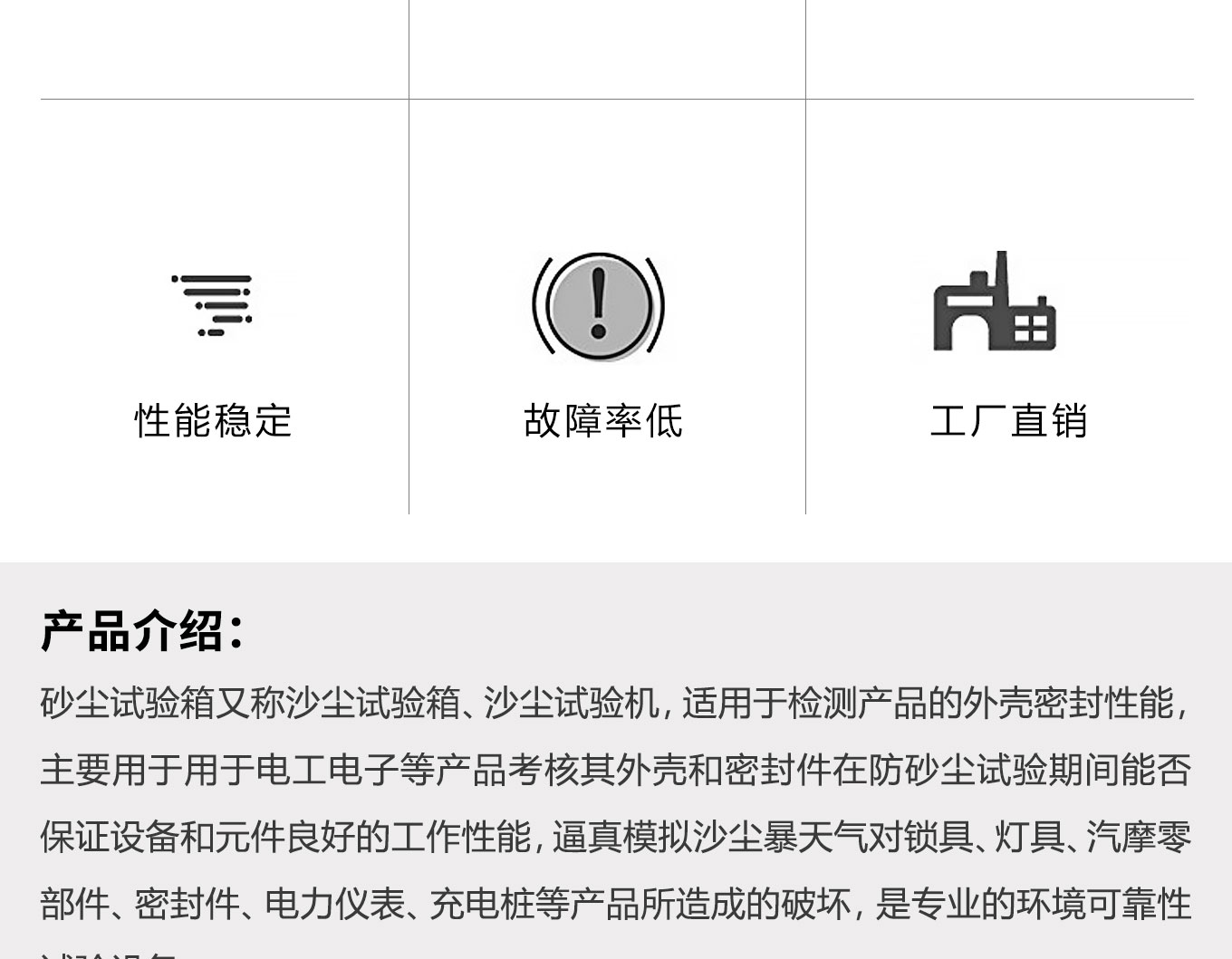 砂塵快猫网站入口又稱沙塵快猫网站入口、沙塵試驗機,適用於檢測產品的外殼密封性能,主要用於用於電工電子等產品考核其外殼和密封件在防砂塵試驗期間能否保證設備和元件良好的工作性能,逼真模擬沙塵暴天氣對鎖具、燈具、汽摩零部件、密封件、電力儀表、充電樁等產品所造成的破壞,是專業的環境可靠性試驗設備。