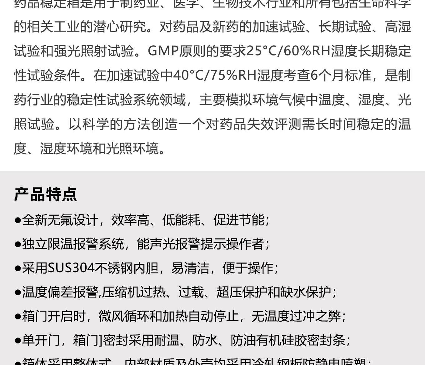 藥品穩定箱是用於製藥業、醫學、生物技術行業和所有包括生命科學的相關工業的潛心研究。對藥品及新藥的加速試驗、長期試驗、高濕試驗和強光照射試驗。主要模擬環境氣候中溫度、濕度、光照試驗。以科學的方法創造一個對藥品失效評測需長時間穩定的溫度、濕度環境和光照環境。